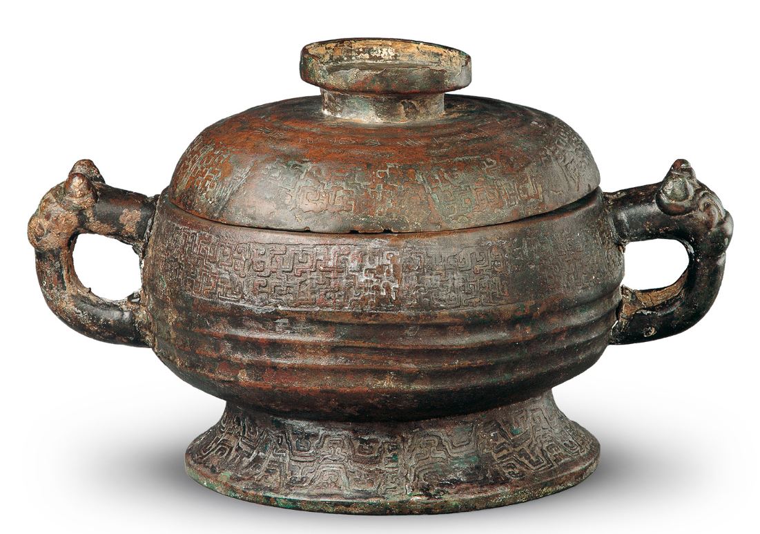 这件青铜簋双耳,有盖,圈足外撇。盖边缘及器口下饰勾连形蟠螭纹,腹部饰瓦纹;双耳有兽首装饰;圈足饰波带纹。盖内有铭文54字,器内有铭文51字,记述了秦国的祖先已建都12代,作器者要继承前辈事业,永保四方土地。另外器盖还有秦汉时期后刻的铭文各8字,记录了此簋在秦汉是为西县官物,曾被当做容器使用。