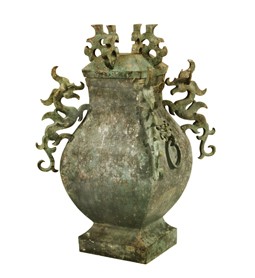 酒器和礼器。铜壶带盝顶形盖,盖顶四面坡各有一个镂空云形钮。壶为直口,短颈,溜肩,鼓腹,平底,高圈足。壶身周正,棱角分明,四角的肩部各铸有一条神采飞扬、昂首攀爬的立体夔龙。壶腹两侧各有一个兽面衔环铺首,兽面狰狞,双晶倒竖,眉须涡卷。壶的四周刻有优美流畅的铭文450字,是一篇优秀的战国书法作品。