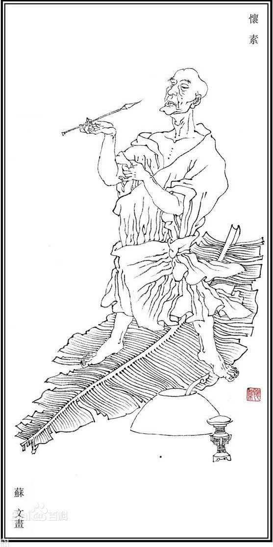 自幼出家为僧,经禅之暇,爱好书法,与张旭齐名,合称“颠张狂素”,形成唐代书法双峰并峙的局面,也是中国草书史上两座高峰。怀素草书,笔法瘦劲,飞动自然,如骤雨旋风,随手万变。书法率意颠逸,千变万化,法度具备。