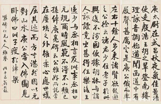 行书四屏轴 纸本 均纵:167公分 横:42公分清 松禅老人翁同龢(一八三O—一九O四),江苏常熟人。从小受父亲兄长影响,喜欢读书,有志於经国大业。咸丰六年考中进士以後,出任官职,尽忠职守,曾经两度入军机兼总理各国事务大臣,为同治、光绪两朝帝师。后无意间获罪去职,仍然忧心国事,时而涕泪纵横,老臣耿耿忠心令人叹服。翁同龢书法兼习各家之长,能以持平态度兼取碑帖长处,而不以优劣论定碑帖。他对汉隶以及颜真卿书学体悟较深。此件书屏即录写颜真卿〈争坐位帖〉,虽然和原帖笔法不尽相同,气息淳厚宽博,能得颜书精神。在翁同龢传世作品中,可许为行书代表作之一。年代为估计
