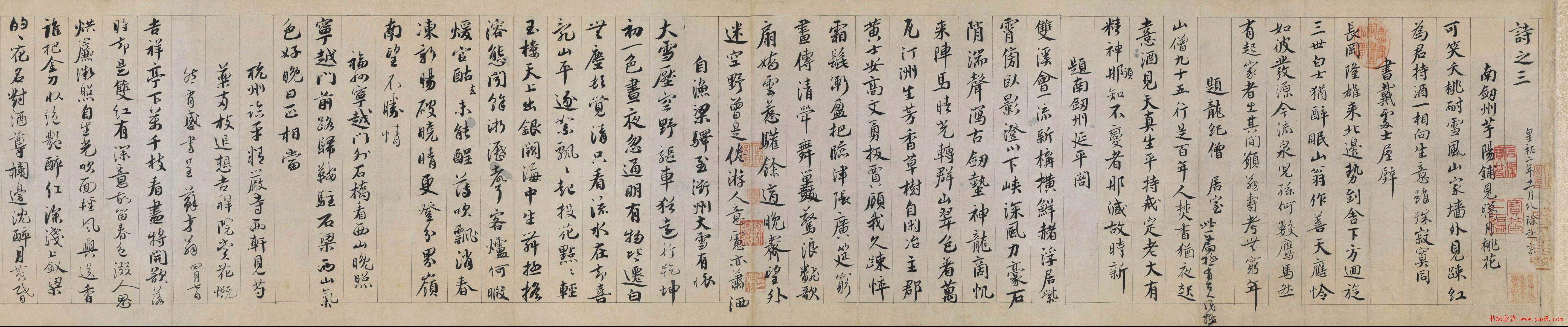 《蔡襄自书诗》,作者:蔡襄,纸本,三接纸,纵28.2cm,横221.2cm,行书,73行,884字。现藏北京故宫博物院。1050年(北宋皇祐二年),蔡襄罢福建转运使,召还汴京修起居注,遂从福州一路北行,历时半年多。沿途见闻有感于怀者,皆成诗章,此卷所书五言、七言诗11首即是。书写时间当在诗成之后不久,蔡襄时年约40岁。因属个人诗稿,无意求工,故笔致飘逸流畅,点画婉转精美,充分展示了蔡襄中年清健圆润的书风特色与纯熟的功力。近代朱文均赞云:“此册行楷略备,无不臻美。其婉约处极似虞永兴,而温栗不减柳谏议。盖其能博采约举以自成一家书派者。”