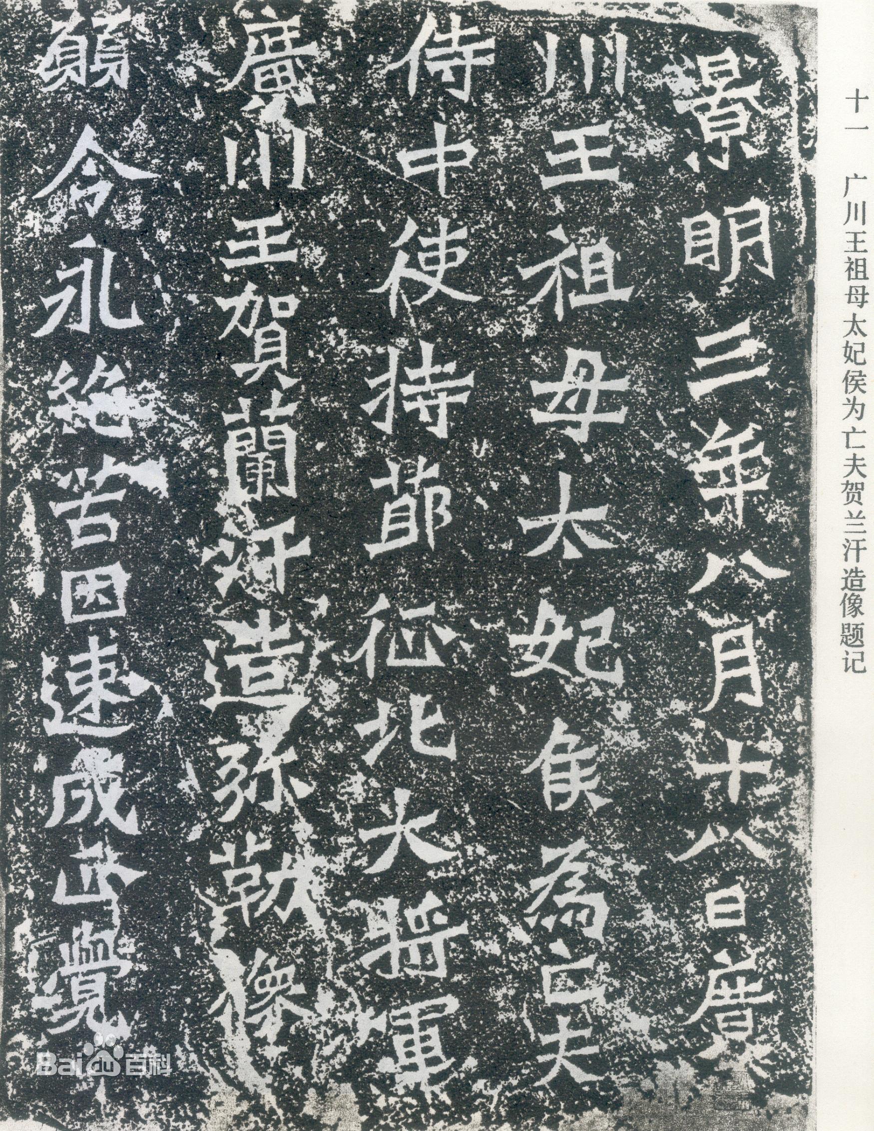 景明三年八月十八日,广川王祖母太妃侯为亡夫侍中、使持节、征北大将军、广川王贺兰汗造弥勒像,愿令永绝苦困,速成正觉。