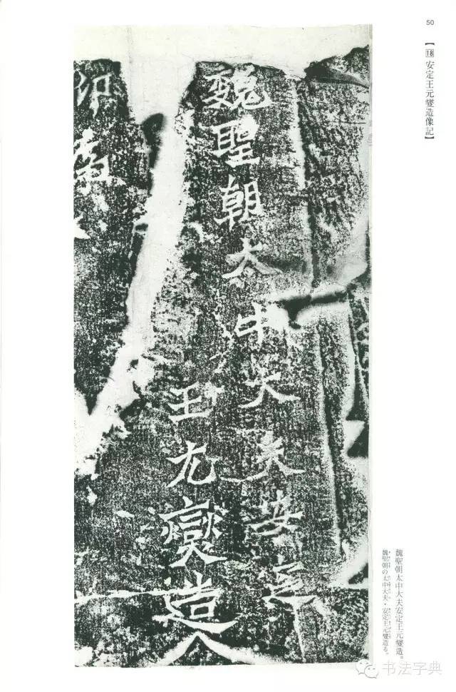魏圣朝太中大夫安定(石坏空五格)王元夑(安定王元休之次子,世宗初袭爵,官至华州刺史,延昌四年九月卒)造亡祖亲太妃亡考太傅静王(既元休,官至太傅卒,谥靖王。静靖古通)亡妣(旧释妃,非是)蒋非及见存眷属敬就/静窟(即古阳洞)造释迦之容(容者像也)并其立侍(弟子是也)众彩圆饰云**(*乃仙之俗写,*即焕字)然愿亡存居眷永离秽趣升超遐(记从段乃重写)迹常值诸佛龙华为会又愿一切群生咸同斯福正始四年二月中记。