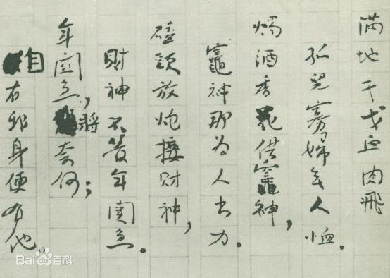 陈独秀的《丁巳除夕歌》写的是1917年的除夕,发表在1918年3月15日《新青年》第四卷第三期上,是一首白话诗。他以满腔悲愤之情诉说当时社会之不公,贫富之不平,寄托了对被压迫被凌辱者的同情,以及对祖国、对民族命运的忧思。在诗中他写道:“我有千言万语说不出,十年不作除夕歌。”“万人如海北京城,谁知道有人愁似我。”丁巳除夕,陈独秀的感受就是这样凄凉、悲愤。 附:陈独秀的《丁巳除夕歌》古往今来忽然有我,岁岁年年都遇见他。明年我巳四十岁,他的年纪不知是几何。我是谁?人人是我都非我。他是谁?人人见他不识他。他为何?令人痛苦令人乐。我为何?拿笔方作除夕歌。除夕歌,除夕歌;几人嬉笑几人泣。富人乐洋洋,吃肉穿绸不费力。穷人昼夜忙,屋漏被破无衣食。长夜孤灯愁断肠,团圆恩爱甜如密。满地干戈血肉飞,孤儿寡妇无人恤。烛酒香花供灶神,灶神那为人出力。磕头放炮接财神,财神不管年关急。年关急,将奈何;自有我身便有他。他本非有意作威福,我自投罗网自折磨。转眼春来,还去否?忽来忽去何奔波。人生是梦,日月如梭。我有千言万语说不出,十年不作除夕歌。世界之大大如斗,装满悲欢装不了他。万人如海北京城,谁知道有人愁似我。